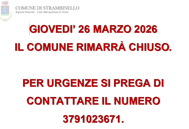 Oggi gli uffici rimarranno chiusi. Per urgenze contattare il Sindaco: 3791023671